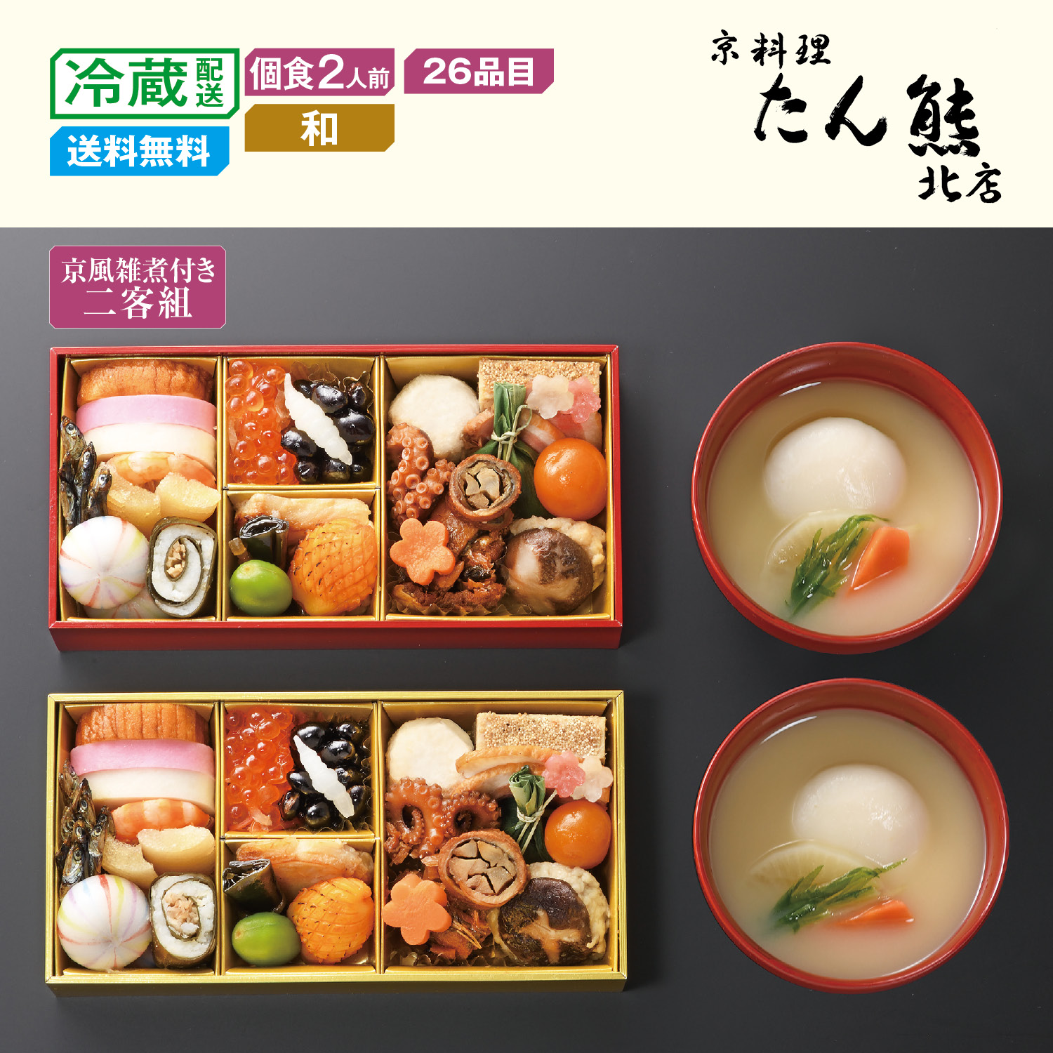 ご夫婦にぴったりの取り分け不要の個食おせち二客組。黒豆や田作りの定番メニューに加え、穴子八幡巻や鱈旨煮などが食べきりサイズのお重に盛り付けられています。セットの京風雑煮と合わせて、お正月を迎えることができます。厳選した焼きあご出汁を使用した風味豊かな雑煮は、大きめの野菜を京雑煮ならではの白みそで仕上げた上品な味わいです。